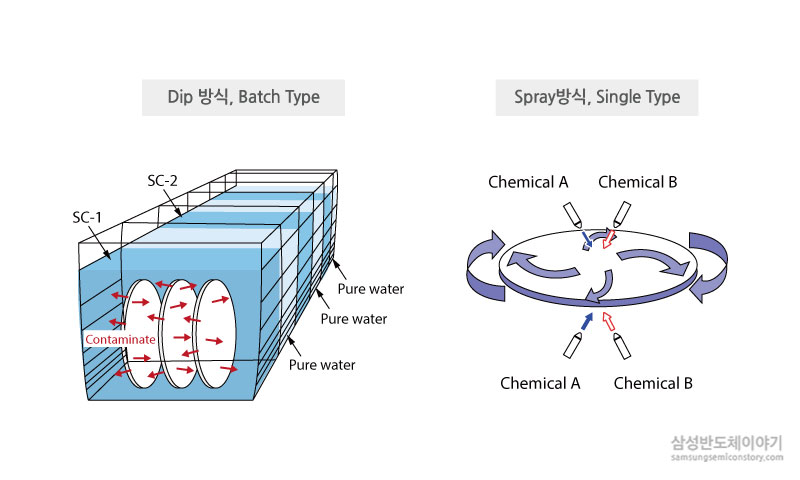 : 낱장의 wafer를 회전하는 원판 위에서 chemical을 분사하여 세정.