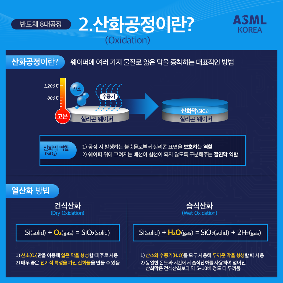 - 고온(800~1,200℃)에서 산소나 수증기를 웨이퍼 표면에 뿌려 얇고 균일한 실리콘 산화막(SiO₂)을 형성.