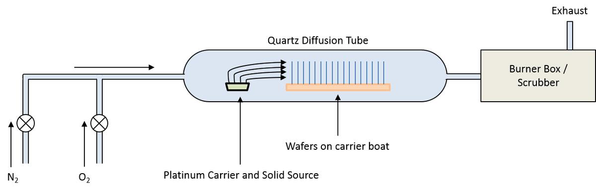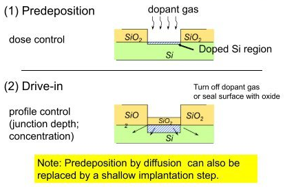 : 고온의 furnace 안에 도핑할 불순물이 포함된 증기에 silicon을 노출하여 doping 후 확산. (2step으로 진행)