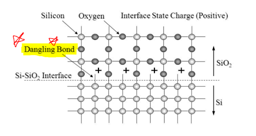 - 접합 계면에서의 단결정 silicon 원자가 silicon 원자나 다른 원자와 결합을 하지 못하고 옥텟 규칙이 깨지게 되어 1개의 빈자리가 발생한 것.