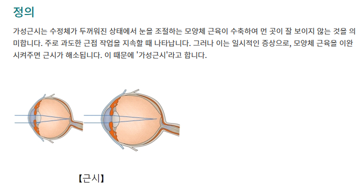 가성근시는 우리 눈의 조절근이 아주 오랫동안 가까운 물체를 지속적으로 보느라 수축한 상태로 계속 있다 보니 그 상태로 굳은 거라 보시면 됩니다.