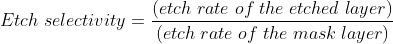 - 작업속도와 생산성에 중요한 지표.2) etch selectivity = 대상 막질(etch 되어야 함)의 etch rate / 하부 막질(etch 되지 않아야 함)의 etch rate